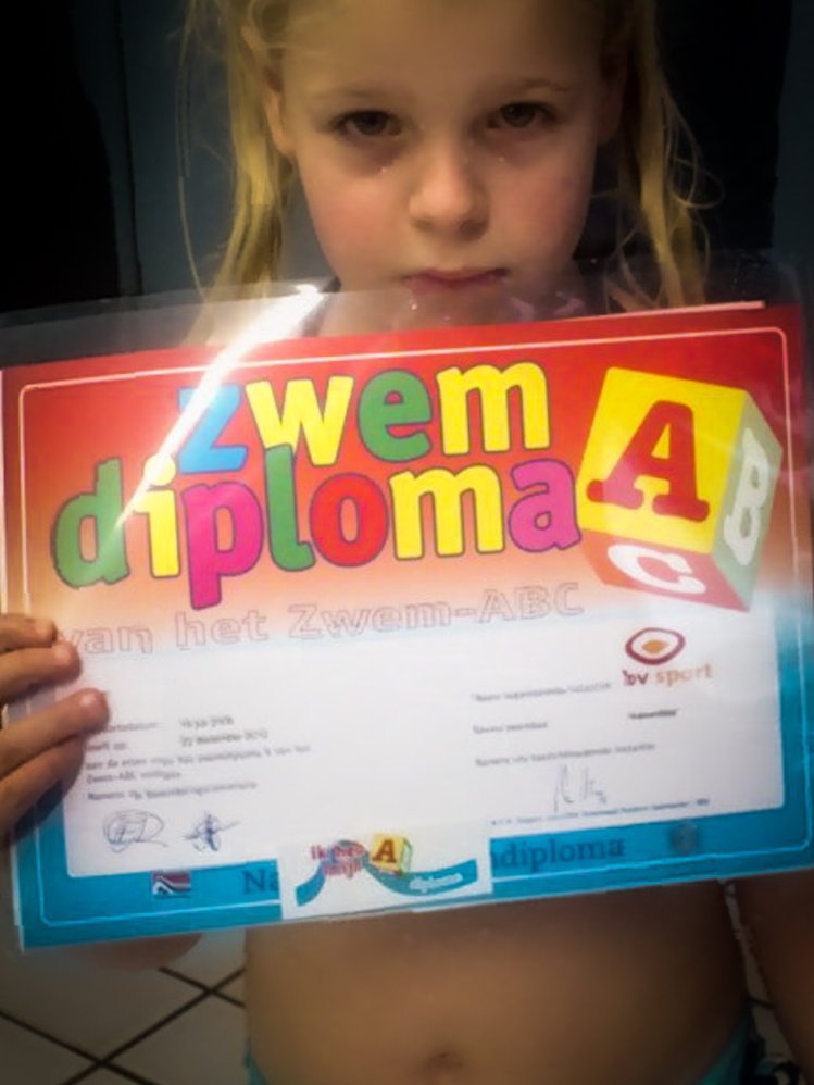 Het hoort er bij, vooral in ons waterrijke landje: zwemdiploma’s halen. En menn, wat ben ik er klaar mee, dat hele zwem-gedoe. Hoe mensen met drie of meer kinderen het allemaal doen, is mij een raadsel. Ik kan na nummer twee al geen zwembad meer zien!