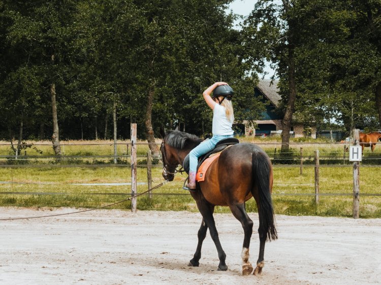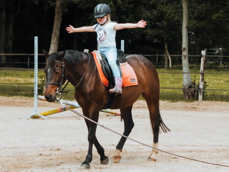 Maar – hoe kan het eigenlijk ook anders? – de les was een groot succes! De spanning die eerst zo voelbaar en zichtbaar was middels een te serieus koppie en handjes die zich aan het zadel vast klampten, verdween best snel. Balans oefeningetjes zoals één hand op de cap, dan de andere hand en uiteindelijk beide handen los, helpen het zelfvertrouwen enorm. Een voorzichtig drafje werd geprobeerd en uiteindelijk was ook het plezier zichtbaar. Dit was weer genieten, zowel voor haar als voor mij!