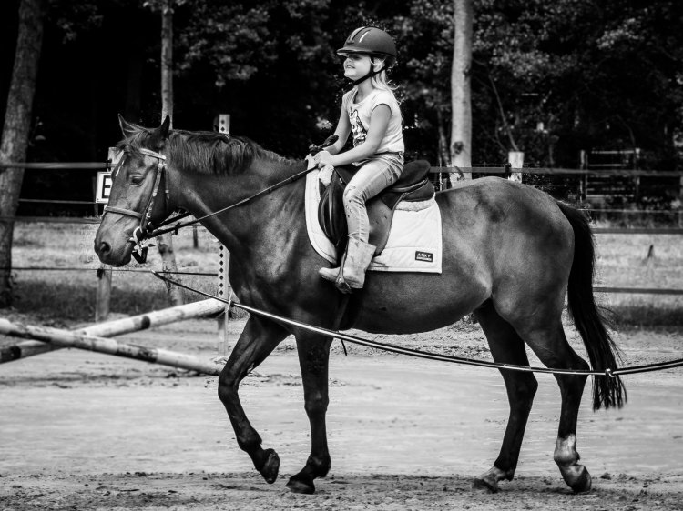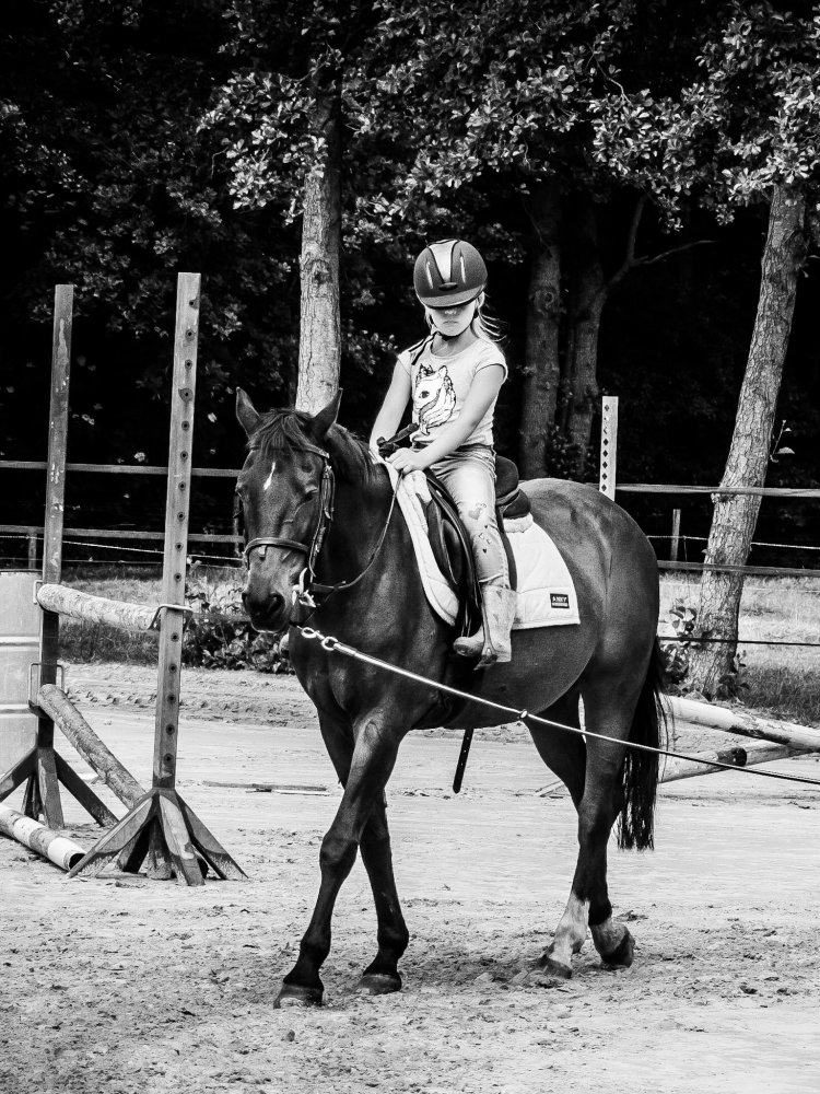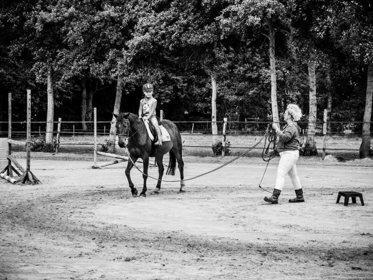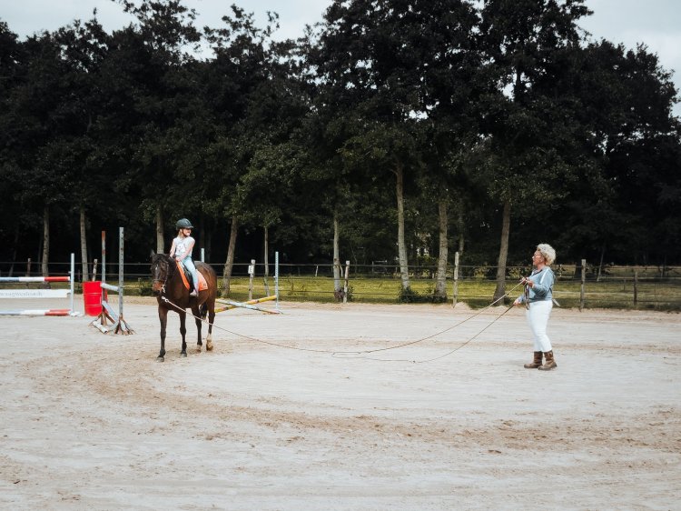 Toch tijdens de eerste les bij Wiepkje, heb ik werkelijk met open mond naar mijn kind zitten kijken. Daar waar bij die andere manege Nouri altijd gespannen was en iemand naast het paard moest lopen, zag ik hier na een kleine tien minuten de spanning uit zijn schoudertjes zakken. En waar hij daar niet verder kwam dan een voorzichtig drafje, galoppeerde hij nu aan het eind van de les doodleuk zelfstandig een volte. Wat? Hoe dan?
