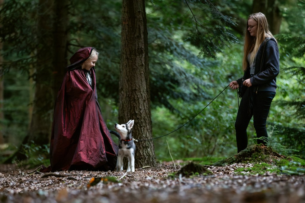 Het is een hervertelling van het aloude sprookje, maar dan met échte foto’s in plaats van illustraties en mijn dochter in de hoofdrol als Rood Kapje. Kyra, de pup van mijn vriendin Nynke, neemt de rol van de nog niet zo Grote Boze Wolf op zich.